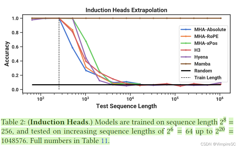 展示了“诱导头”(Induction Heads)任务的外推结果。模型在序列长度为256(2^8)上进行训练,并在增加的序列长度上进行测试,从64(2^6)到1048576(2^20)。