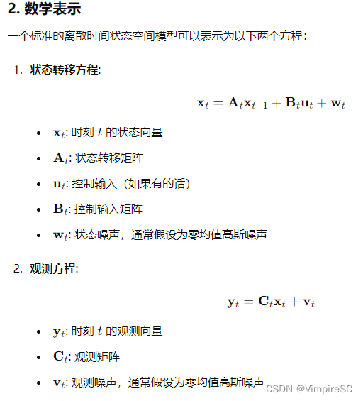 - 状态转移方程(State Transition Equation): 描述状态变量如何随时间变化,通常是前一时刻状态和噪声的函数。