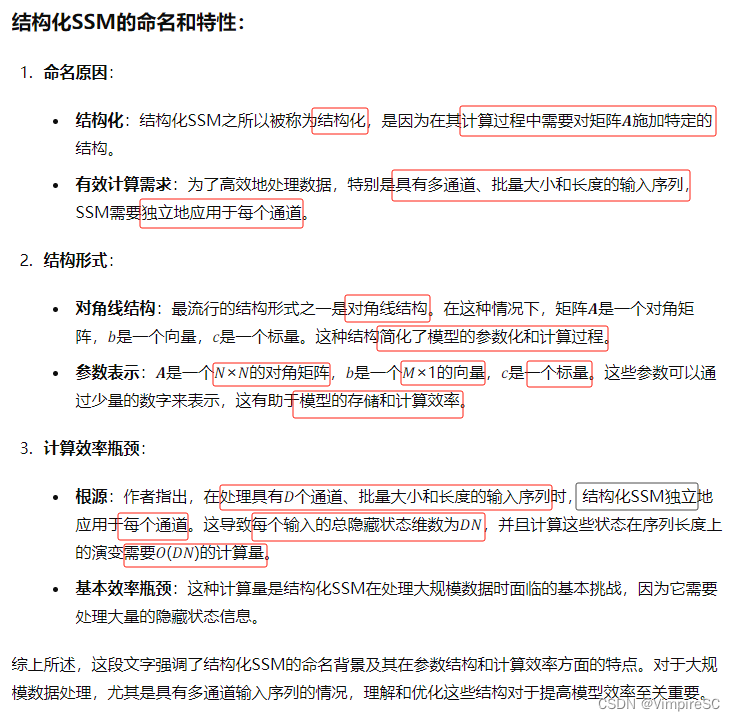 讨论了结构化SSM(结构化状态空间模型)的命名原因和其特定的结构化形式,重点是如何有效地计算这些模型