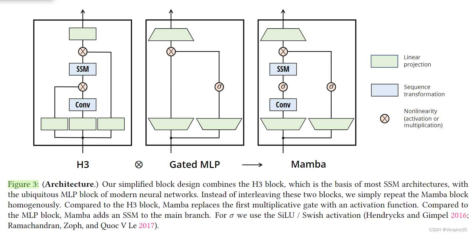 描述了一种简化且高效的架构设计,融合了SSM的优点和现代神经网络的技术,通过合理的参数设置和模块设计,实现了更高效的序列处理能力。Mamba架构的设计灵感来自多种已有的技术,如GAU、SwiGLU和RetNet,并在此基础上进行了创新和优化。