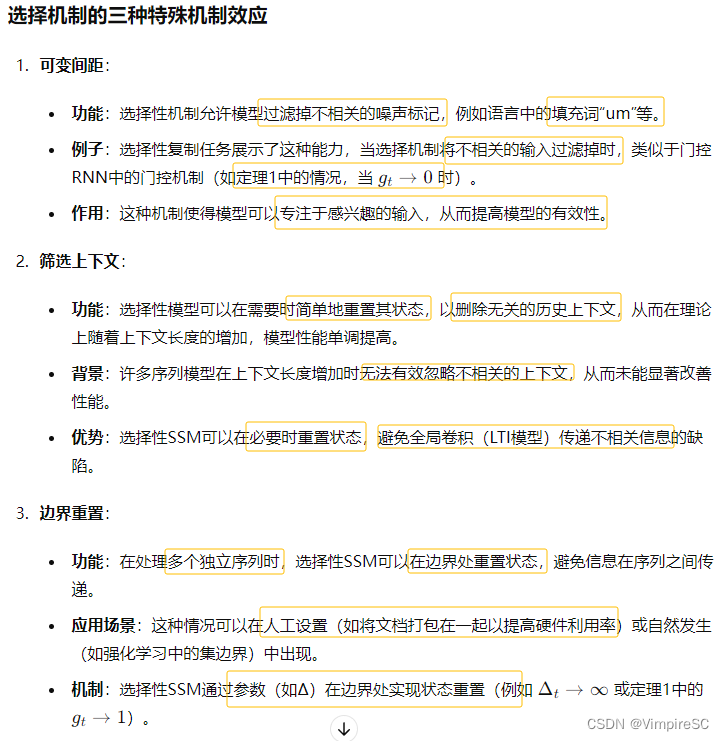 深入探讨了选择机制在SSM(State Space Models)中的应用,并详细解释了它如何通过控制不同参数(如Δ、A、B和C)来实现过滤噪声、筛选上下文和重置边界等功能。