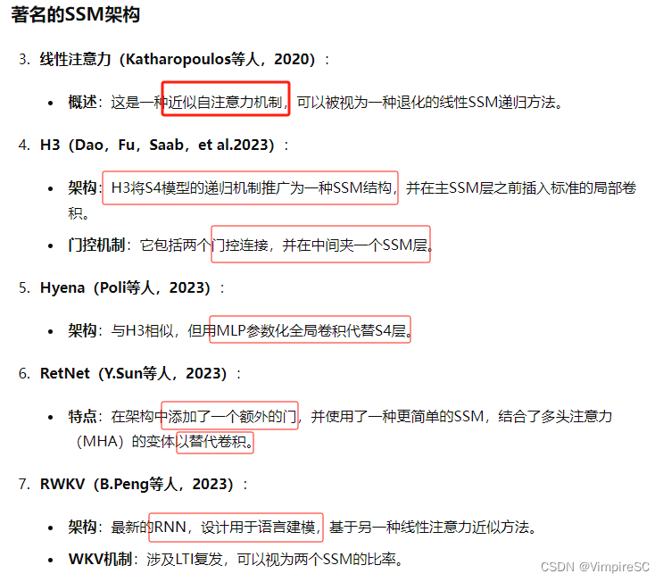 介绍了一些著名的SSM架构,如线性注意力、H3结构、Hyena结构、Retnet和RWKV