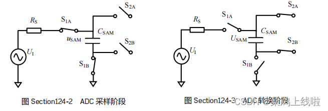 S1A,S1B闭合,S2A,S2B断开,输入信号通过电阻RS给电容充电,以完成输入信号的采样。假设Ui为满幅值输入直流量,ADC采样位数为N,我们一般要求这个误差小于ADC的最小分辨率的一般,也就是0.5个LSB,相当于满量程的1/2^(N+1),故。而ADC内部采样的电容是确定的,一般是10PF级别的这就要求外部串联 的源电阻不得大于某个值。上图中,USAMA是狗能够接近Ui,取决于采样时间TSAM,以及电阻电容大小:当TSAM远小于阻容时间常数时,误差会非常小。采样阶段结束,立即进入转换阶段。