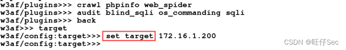 2.通过渗透机Kali Linux对靶机Linux进行Web渗透测试,使用工具w3af对Web服务器进行审计,在w3af的命令行界面下加载爬行模块来搜集phpinfo信息及蜘蛛爬行数据,将该操作使用的命令作为Flag值提交;