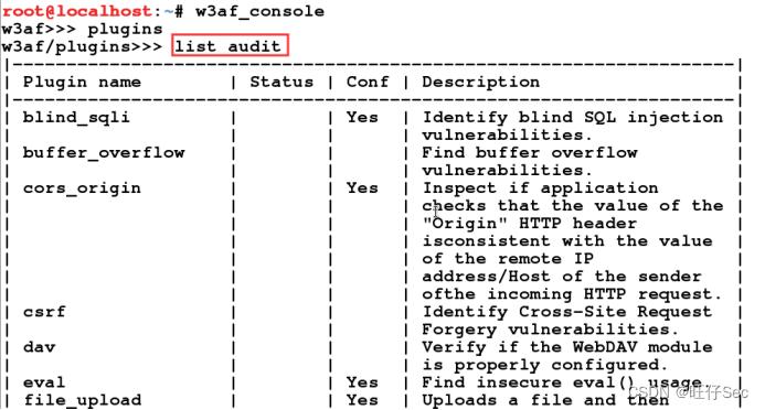 进入Kali Linux命令控制台中使用命令w3af_console进入w3af命令行模式,通过输入命令“plugins”对插件进行配置,再使用命令list audit即可列出所有审计模块