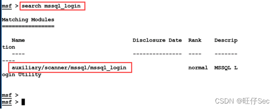 使用命令use auxiliary/scanner/mssql/mssql_login调用mssql弱口令模块