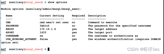 4.在上一题的基础上使用命令调用该模块,并查看需要配置的信息(使用show options命令),将回显中需要配置的目标地址,密码使用的猜解字典,线程,账户配置参数的字段作为FLAG提交(之间以英文逗号分隔,例hello,test,..,..);