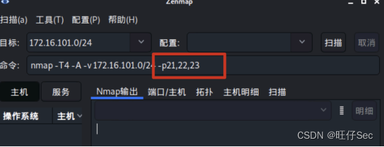 - 在本地PC渗透测试平台Kali中使用zenmap工具扫描服务器场景Server18-2所在网段(例如:172.16.101.0/24)范围内存活的主机IP地址和指定开放的21、22、23端口。并将该操作使用的命令中必须要添加的字符串作为FLAG提交(忽略ip地址);