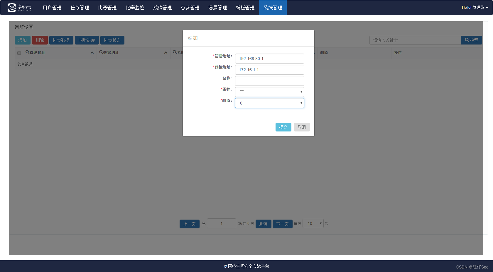 2.设置群集,点击系统管理里的群集设置,然后添加管理口的IP和数据口的IP,然后提交。