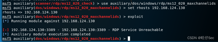 再次调用dos/windows/rdp/ms12_020_maxchannelids模块,使用命令exploit溢出模块,发现已 经无法对目标靶机进行利用。