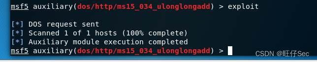 接着使用拒绝服务模块,来进行测试,验证漏洞在Windows Server 2008上的可用性。使用命令use auxiliary/dos/http/ms15_034_ulonglongadd来调用HTTP.SYS拒绝服务模块,然后设置RHOSTS目标靶机参数,并进行利用