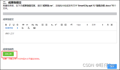 移动应用开发赛项提供了技能竞赛平台,选手根据分配的账号登录系统,竞赛结束前,在系统下方成果物提交区,上传A、B两个模块的“成果物.rar”文件,压缩包内包括发布文件“SmartCity.apk”和“缺陷分析.docx”两个文件。