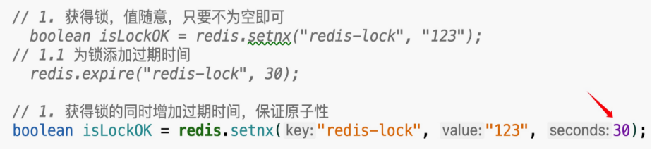 一旦后续发生故障,那么30秒后还是能释放锁。但是这个时候还是会有问题,程序正好运行到1.1还没来得及设置过期时间,拉电了,此时锁设置成功,但是没有设置过期时间,还是有问题,所以,要么全设置成功,原子性必须得保证。我们可以使用 setnx内置的,可以多加时间参数来设置。
