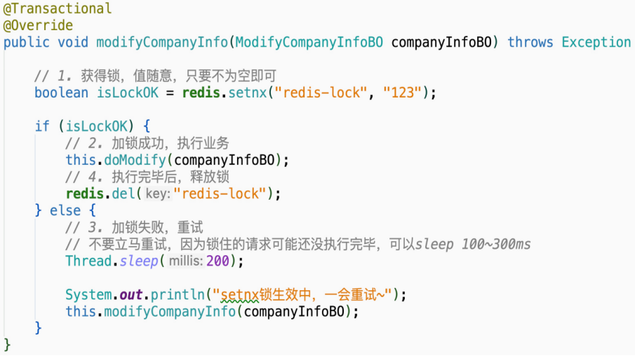 目前所使用的递归方案,高并发时也容易造成内存溢出,那么其实可以改造一下,改为死循环即可只要获得锁失败,则返回去尝试获得锁即可