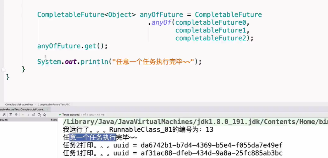 初始化CompletableFuture后,同时进行两个任务,两个任务完成后进行相应回调,所以以上的相关API完全可以把3对甚至多个任务组合起来进行执行甚至嵌套,如此可以更好的去管理多线程的执行顺序。