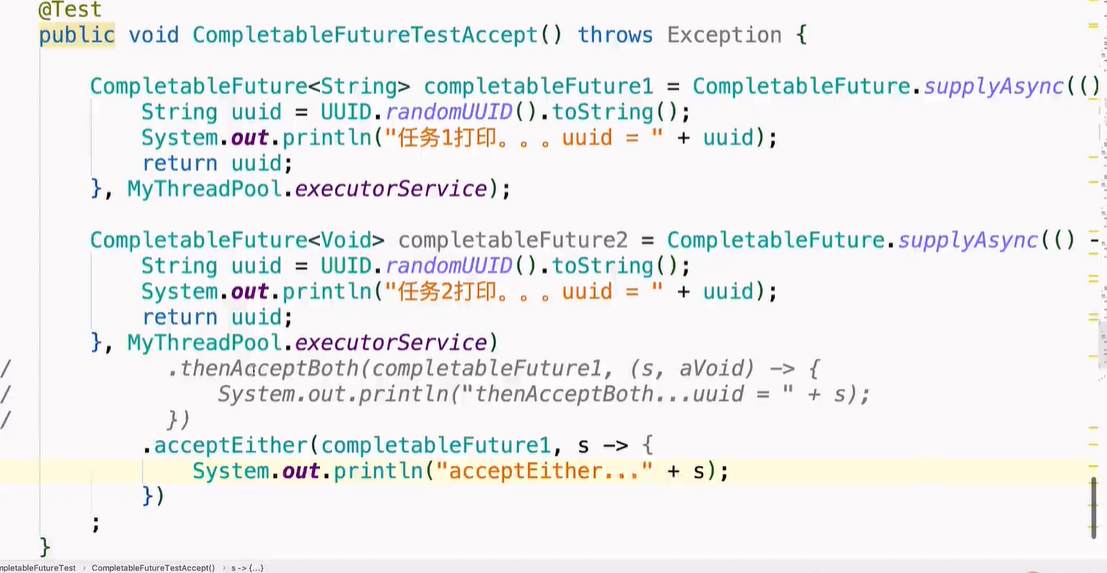 thenAcceptBoth: 两个任务都执行完了,可以接受两个任务的参数,但是thenAcceptBoth不能返回值,是void类型