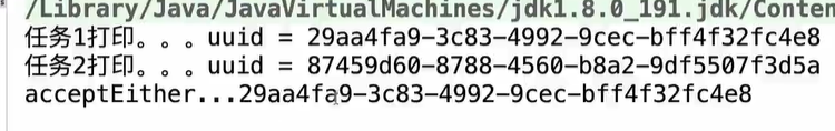 acceptEither:其中一个任务完成,就开始执行,必须两个任务都是有返回值的,
