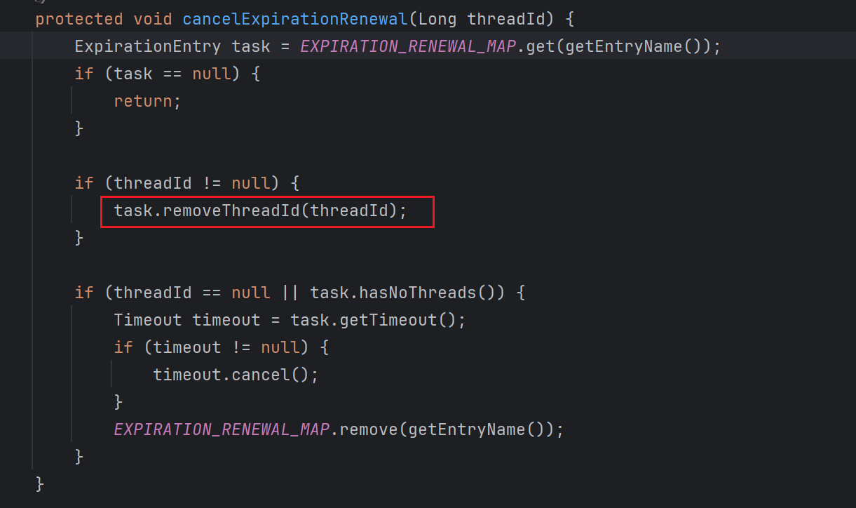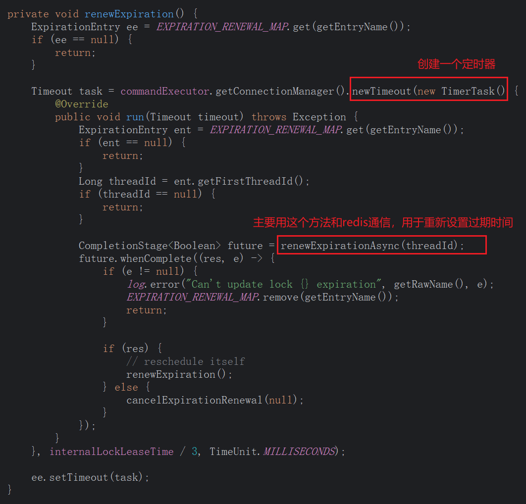 也就是说,即使我们不传入超时时间,Redisson也会自动给我们设置一个默认的超时时间30s。下面再来看神秘的scheduleExpirationRenawal()方法,这是在占锁成功后进行监听过程中涉及到的方法,须注意的是如果我们传入了自定义超时时间是不会执行该方法的。再看这个方法里面有一个重要的方法——renewExpiration(),看名字也能猜出来这是用于重新设置超时时间。进入这个方法,看核心部分可以知道主要是通过一个连接管理器创建了一个定时任务,任务的内容就是用lua脚本和redis通信重新设置超时时间,这个过期时间依然是看门狗的超时时间30s。