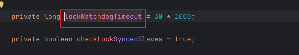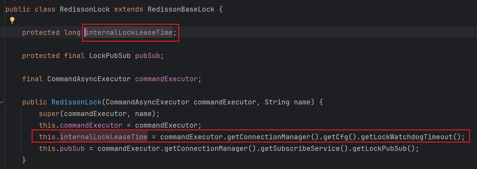 来看一下tryLockInnerAsync()方法在这里传入的参数,当前面没有传入超时时间时,这里传入了一个“internalLockLeaseTime”参数来替代,追踪这个参数值,可以看到在RedissonLock构造时为这个参数赋了值,而这个时间值就是配置中的“看门狗”的时间,这个值为30s。