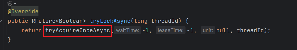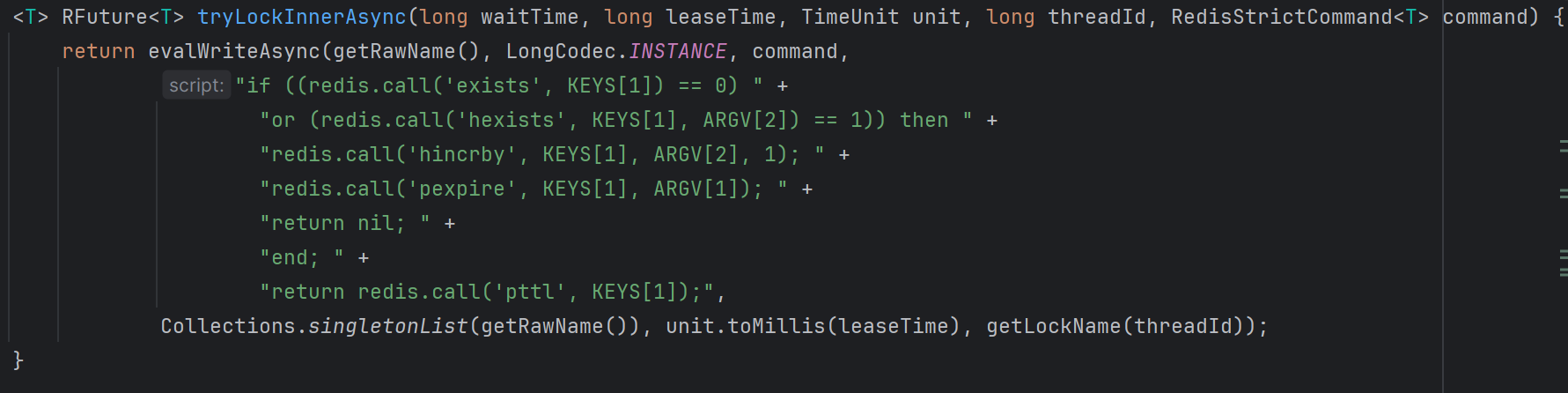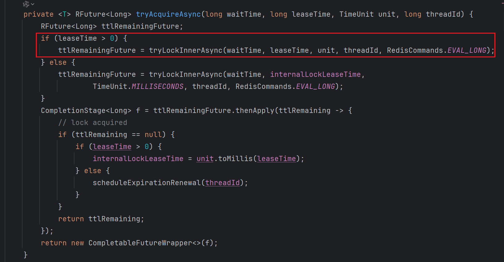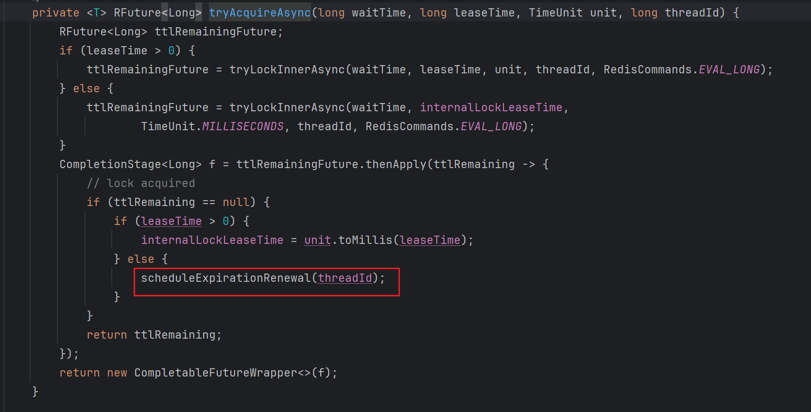 2、第二条路如下图:**如果没有传入超时时间,那么不仅会调用tryLockInnerAsync()方法,还会通过一个scheduleExpirationRenawal()的方法进行锁续期。