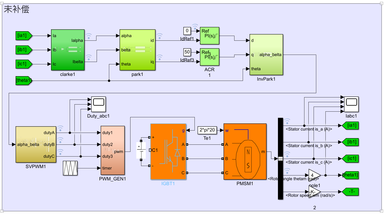 (1)涉及DC直流电源、三相两电平逆变桥、三相交流异步电机、park变换、clark变换、SVPWM、PI控制器、角度和磁链计算、信号测量等单元模块;