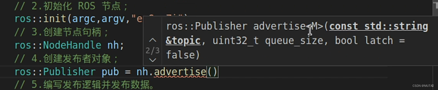 返回值类型ros::Publisher,函数名叫advertise,M指泛型类型,指一会要发布的数据类型,泛型可以自动推导不用写;const std::string&topic指参数1是字符串类型,topic是话题(自定义),unit32_t queue_size是一个长度,在发布数据时,网络阻塞部分数据发不出去,假设发布12个数据,由于网络阻塞都没发出去,因此依次放在队列里面,这里如果设置长度为10,那么前两个数据被抛弃,相当于缓冲区;