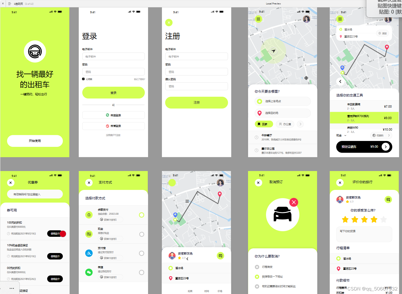 11页Axure原型出行约车APP高保真ui界面设计移动端APP设计稿ui交互作品可编辑源文件(换图、换字、换颜色都可以),每个页面都有交互跳转页面数量:11页原型类型:高保真、低保真界面类型:高保真文件格式:.fig.