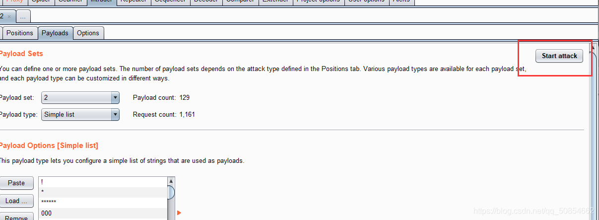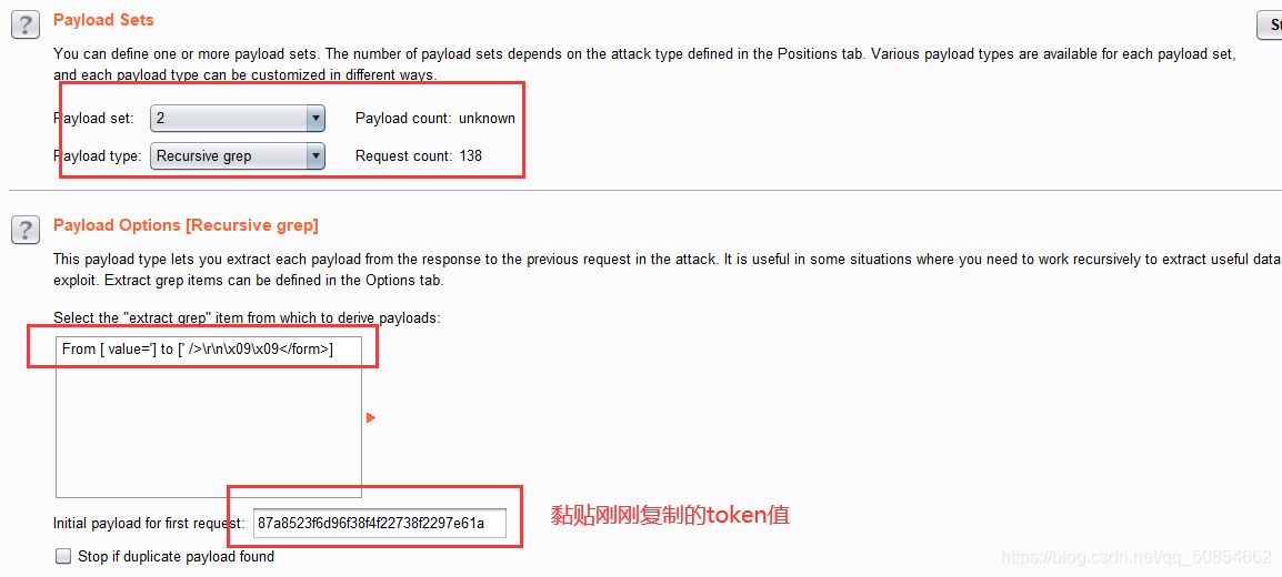 设置密码本,点击payload,选择第一项的密码本与低等级的相同,第二项的时候选择Recursive grep 并且把之前得到的token值粘贴到下方的方框中。