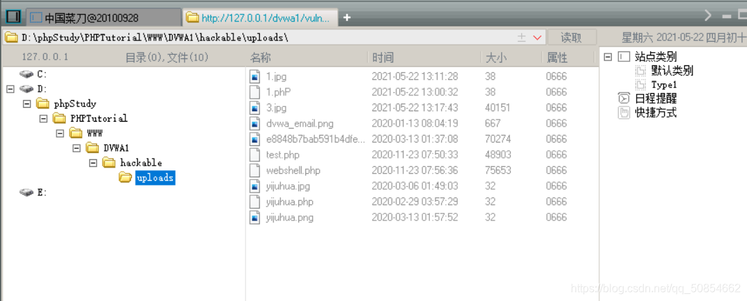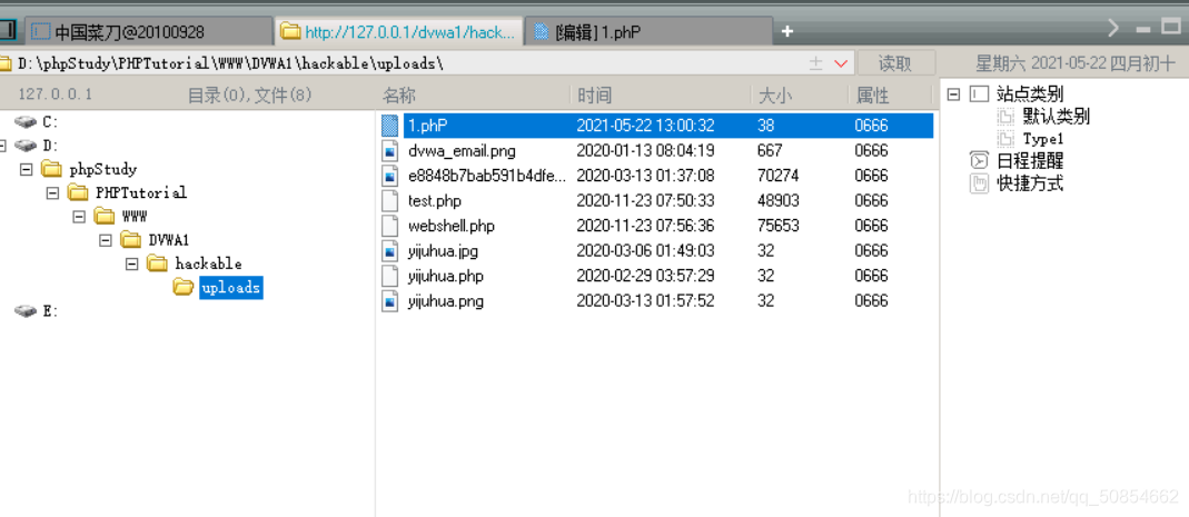 这时我们利用之前的文件包含漏洞来配合中国菜刀连接刚刚上传的一句话木马
