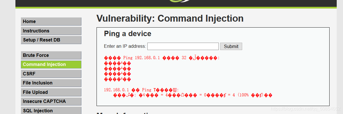 解决此问题的方法:在DVWA-master\dvwa\includes目录下找到dvwaPage.inc.php文件中所有的”charset=utf-8”,修改”charset=gb2312”,即可