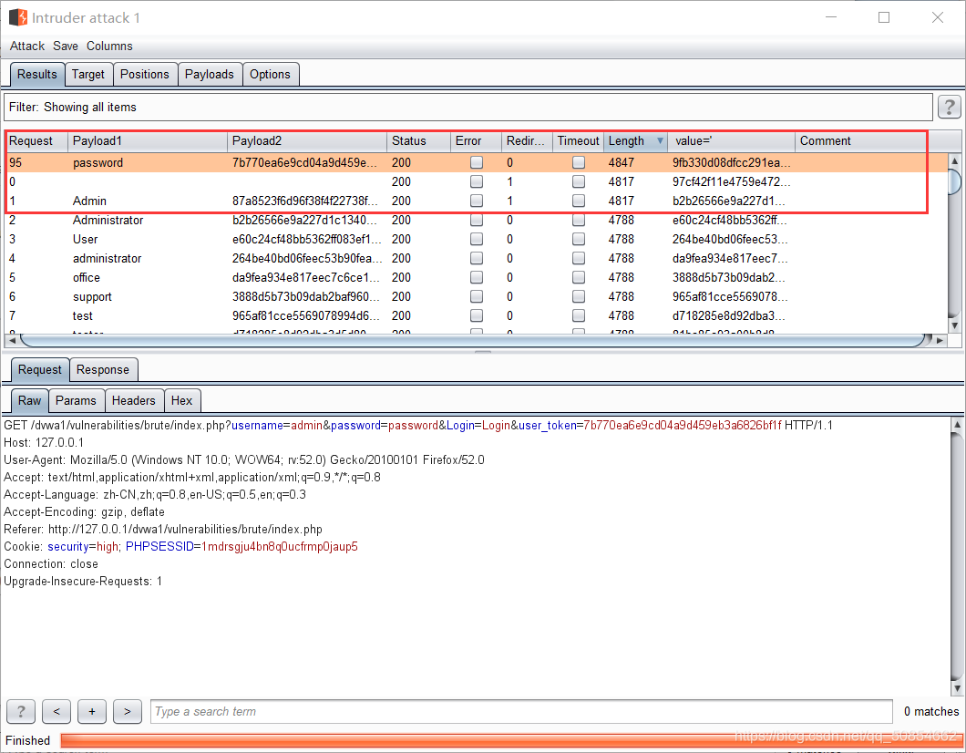 红色部分为破解的密码通过上面的破解,我们发现length的长度存在不一样,不一样的就是为破解成功的账号和密码。