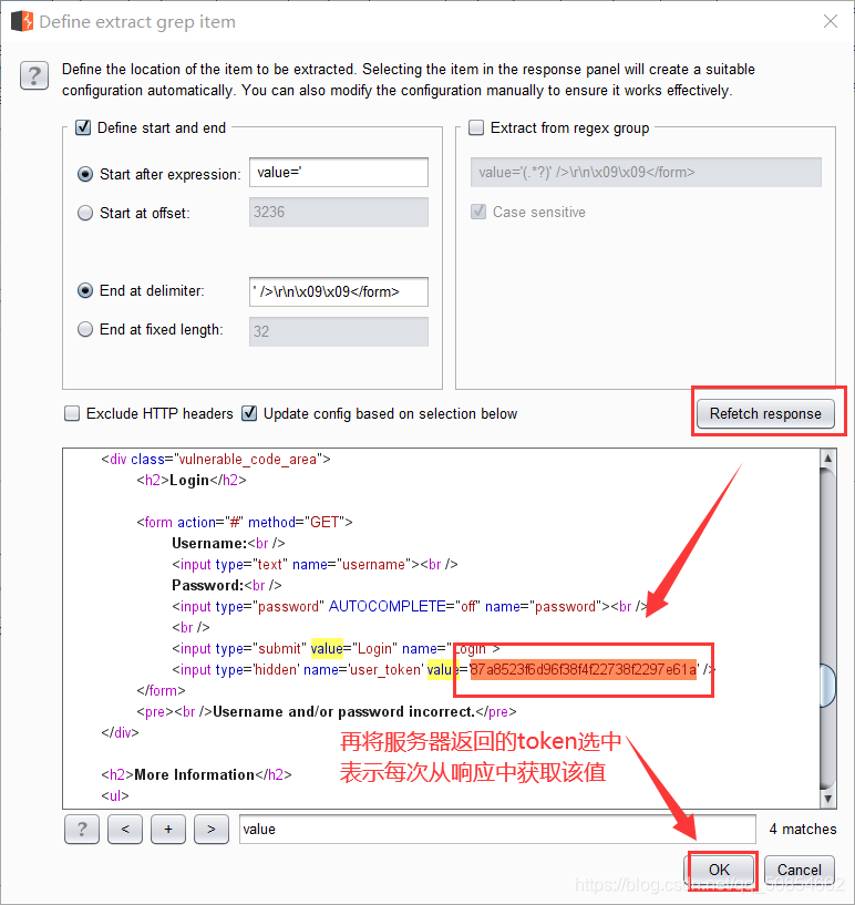 写上value=’ 点击刷新相应信息 服务器返回的token选中(即value后面,表示每次从响应中获取该值)