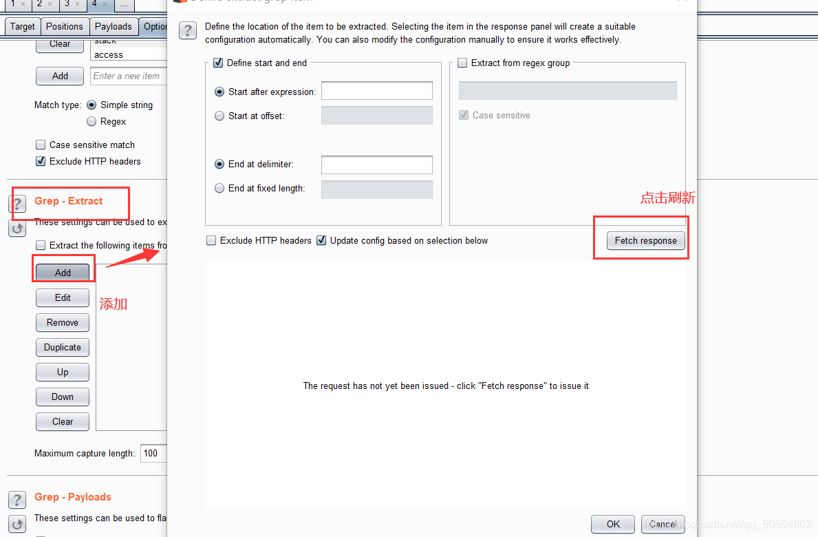 因为Recursive_Grep模式不支持多线程攻击,然后选择Grep-Extract,意思是用于提取响应消息中的有用信息,点击Add,如下图进行设置,最后将Redirections设置为Always