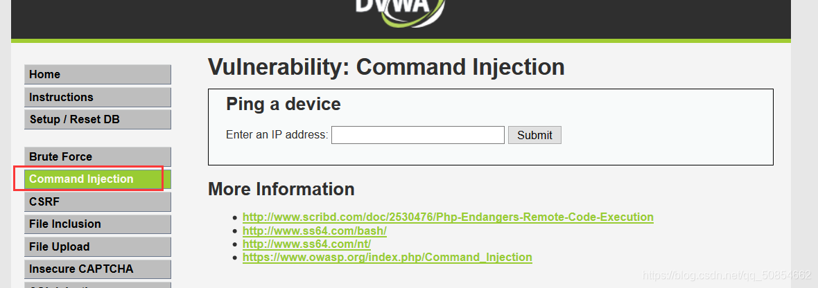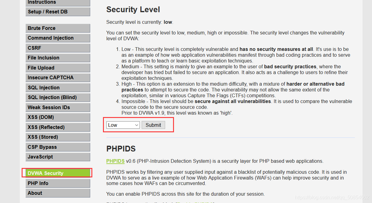 在dvwa security选项中,可以调整dvwa的难易程度,