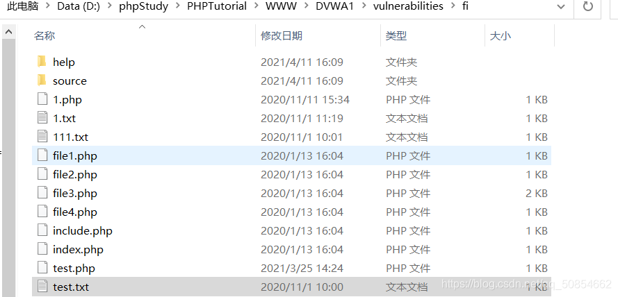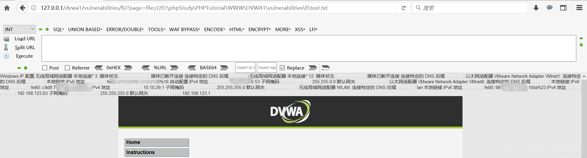 我们在D:\phpStudy\PHPTutorial\WWW\DVWA1\vulnerabilities\fi目录中创建一个测试文件test.txt,文件内容是“<?php system('ipconfig');?>”,通过文件包含漏洞可以直接查看到该文件内容。