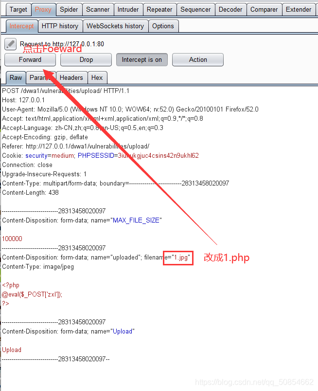 所以我们创建一个1.jpg的文件,使用burp进行修改文件类型