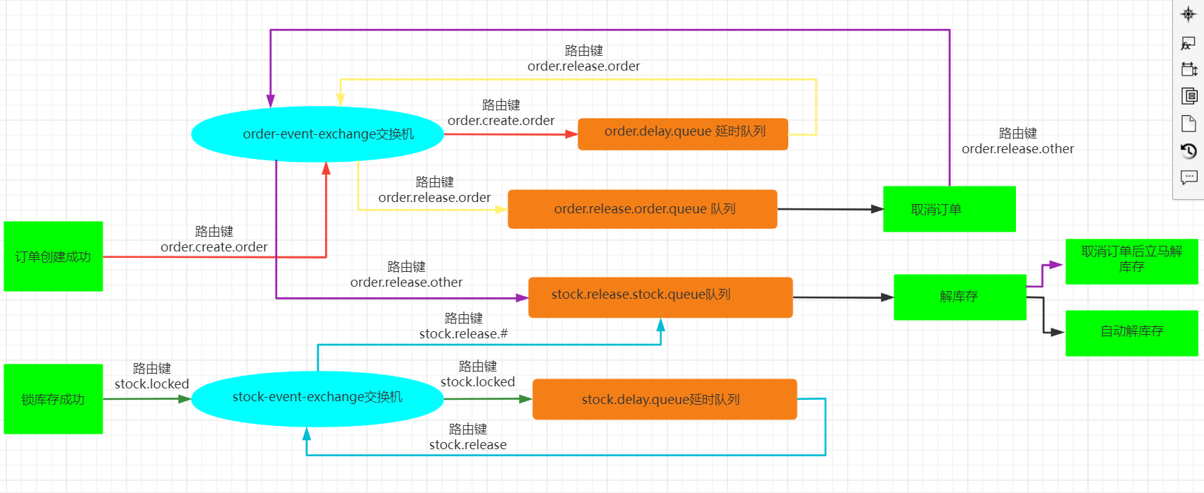 图解:用户点击提交订单按钮后会创建一个订单,把这个订单作为一个消息发给topic交换机order-event-exchange,交换机根据路由键order.create.order路由到延时队列order.delay.queue,然后消息在延时队列里等待指定的时间,当时间过期后把这个消息通过交换机order-event-exchange识别他的新的路由键order.release.order路由到新的队列order.release.order.queue(取消订单的队列),这个队列是用于处理用户提交订单但是没有支付订单的情况,然后订单就会被自动取消,但是这里要考虑一个情况(这个特殊情况是需要额外的处理的),那就是取消订单操作因为网络卡顿导致解库存操作先执行的话,这样就导致导致卡顿的订单永远都不能解锁库存,所以订单取消后立马发消息给order-event-exchange交换机,交换机把这个消息通过路由键order.release.other发到stock.release.stock.queue队列(解库存的队列),这个队列其中有个监听方法就是来监听这个消息的,只要监听到这个消息就会立马执行解库存,还有一种就是正常解库存的操作,当订单成功创建后就进行锁库存,锁库存成功后就会发消息给stock-event-exchange交换机,交换机根据路由键stock.locked把消息路由到stock.delay.queue延时队列,时间过期后就把消息根据路由键stock.release路由到stock.release.stock.queue队列(解库存的队列),然后这个消息队列的消息是被一个专门解库存的监听器来监听(注意这里有两种解库存的监听方法,一个是自动解库存的监听,一个是订单服务的订单取消后立马解库存的监听)