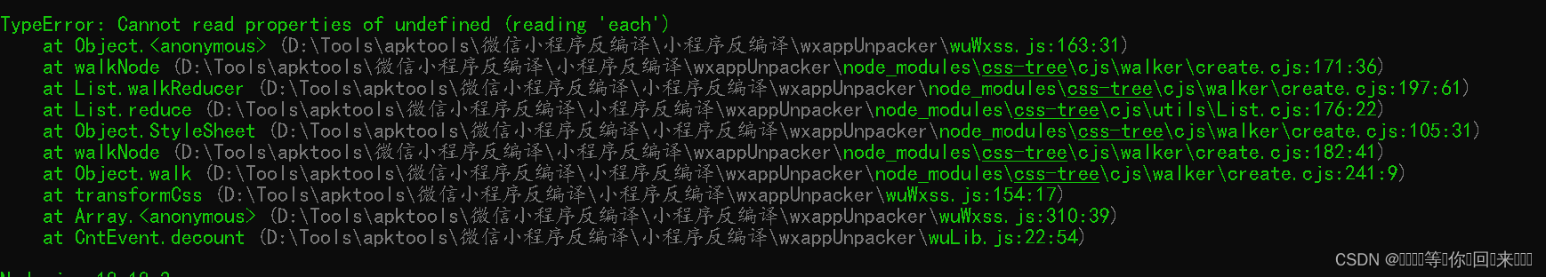 微信小程序反编译报错导致的wxss文件缺失解决方法 报错如下:TypeError: Cannot read properties of undefined (reading 'each')。2、解压替换:解压替换掉wuWxapkg.js文件所在的目录下的node_modules即可。报错原因:依赖没装完全,具体我也不知道是哪个。