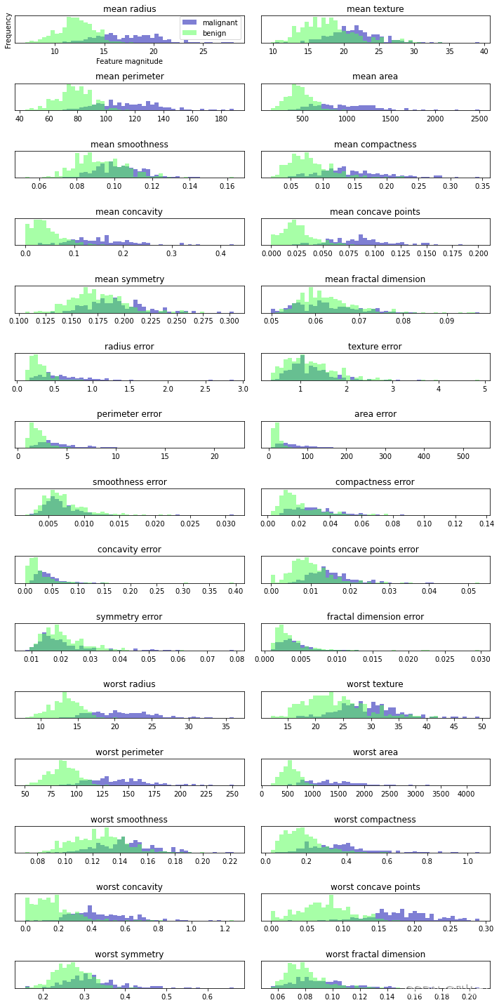PCA最常见的应用之一就是可以将高维数据进行可视化。对于我们熟知的Iris(鸢尾花)数据集(特征量少),我们可以创建散点图矩阵,通过展示特征所有可能的两两组合来展示数据的局部图像。但如果我们想要查看乳腺癌数据集(特征量多),即便用散点图矩阵也很困难。这个数据集包含30个特征,这就导致需要绘制 30 * 14 = 420 张散点图,我们永远不可能仔细观察所有这些图像,更不用说试图理解它们了。但是,我们还可以用另一种可视化方法:对每个特征分别计算两个类别(良性肿瘤和恶性肿瘤)的直方图。