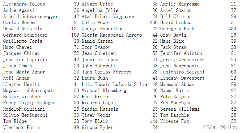 上图为Wild数据集中Labeled Faces的一些图像展示;该数据集一共有 3023 张图像,每张大小为 87 像素 ×65 像素,分别属于 62 个不同的人。我们下面来看看这个数据集中每一个目标出现的次数。