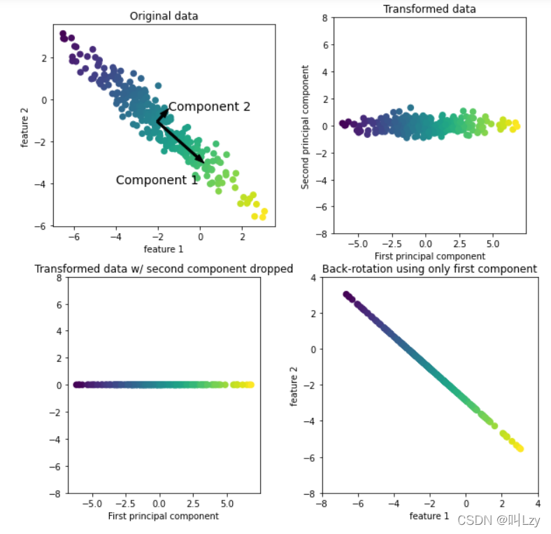 最后,我们可以反向旋转并将平均值重新加到数据中。这样会得到右下角最后一张图中的数据。这些数据点位于原始特征空间中,但我们仅保留了第一主成分中包含的信息。这种变换有时用于去除数据中的噪声影响,或者将主成分中保留的那部分信息可视化。