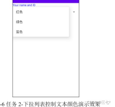 本任务图 3-6 所示,根节点为垂直的线性布局,有 1个 TextView (id 为 tv),显示个人信息;1个下拉列表 Spinner,下拉列表中有 XML 资源文件中自定义的 3 个颜色数据“红色”“绿色”和“蓝色”,点击选项,则文本框 tv 的文本颜色更改为对应的颜色。