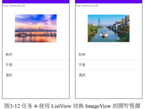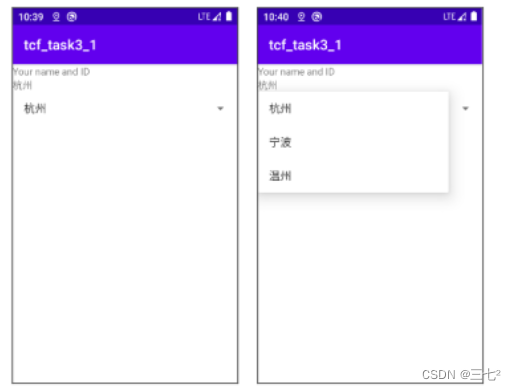 本任务的演示效果如图所示。在该应用中,视图根节点为垂直的线性布局,依次放置3 个Ul:文本框 TextView (显示个人信息);文本框 TextView (id 为 tv result)用于显示下拉列表的选择结果;下拉列表 Spinner,有3 个可供选择的数据“杭州”“宁波”和“温州”,点击 Spinner,会弹出下拉列表显示候选数据,选中某项数据后,下拉列表会收缩,tv result 则显示选中的数据。