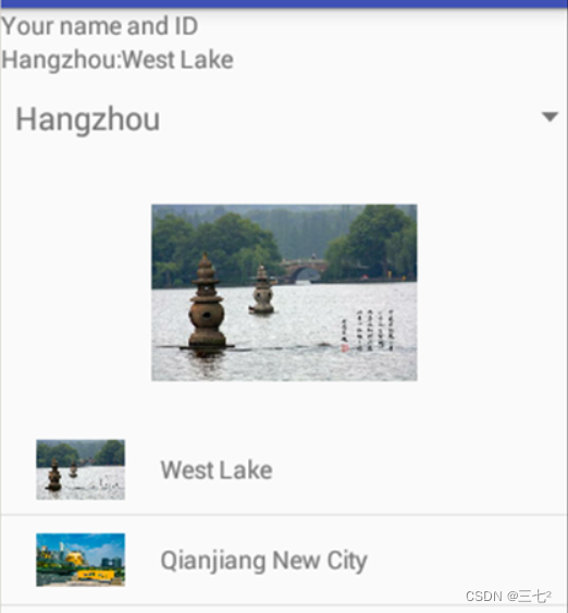 编写一个程序,包含2个TextView(其中一个显示学号姓名),1个Spinner,1个ImageView,1个ListView。Spinner中的内容是城市名称(不少于3个),ListView中的内容是Spinner所选中城市的风景点(响应Spinner的选择事件),TextView显示Spinner的城市和风景点名称(响应ListView的ItemClick事件),ImageView显示所选中城市的风景照。ListView适配器需要改写,使之在一行能显示风景图片和文字。