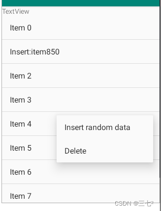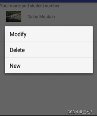 布局根节点为垂直的LinearLayout,依次有1个TextView显示个人信息;1个ListView,显示字符串数据。长按ListView,会弹出上下文菜单ContextMenu,有2个菜单项“插入”和“删除”。选择“插入”,则在长按的位置插入1项随机整型数据,并更新列表视图;选择“删除”,则将长按位置对应的数据项删除,并更新列表视图。
