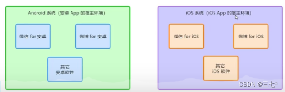 宿主环境(hostenvironment)指的是程序运行所必须的依赖环境。Android 系统和 i0S 系统是两个不同的宿主环境。安卓版的微信 App 是不能在0S 环境下运行的,所以,Android 是安卓软件的宿主环境,脱离了宿主环境的软件是没有任何意义的!