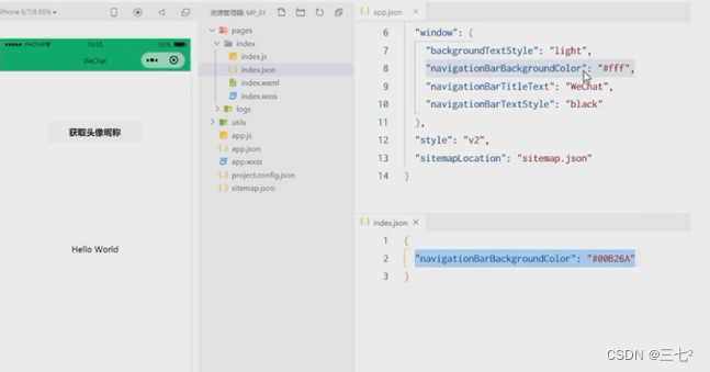 小程序中的每一个页面,可以使用 .son 文件来对本页面的窗口外观进行配置,页面中的配置项会覆盖app.json 的 window 中相同的配置项。例如: